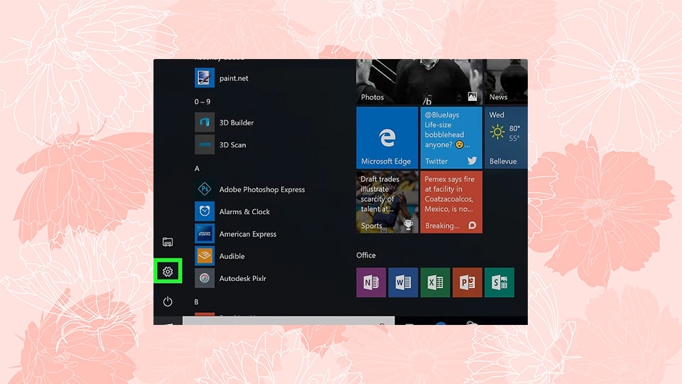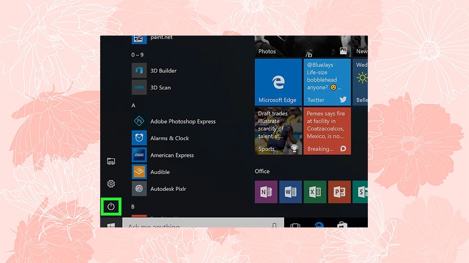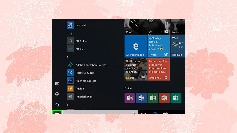 روی نماد ویندوز در گوشه پایین سمت چپ صفحه کلیک کنید.